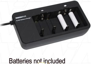 Fast automatic charger for AAA – AA – C – D & 9V NiCd/NiMH cells. Input 240VAC or 12VDC