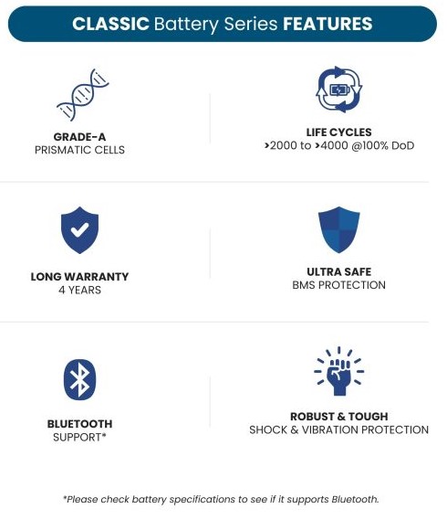 The Classic model 12V 100Ah Lithium LiFePO4 Battery comes in a very compact form factor and is an alternative replacement (AR) for most applications currently using a deep cycle Gel, AGM or Flooded Lead Acid battery. The maximum continuous discharge current is 200A and peak discharge current 400A for 3 seconds.